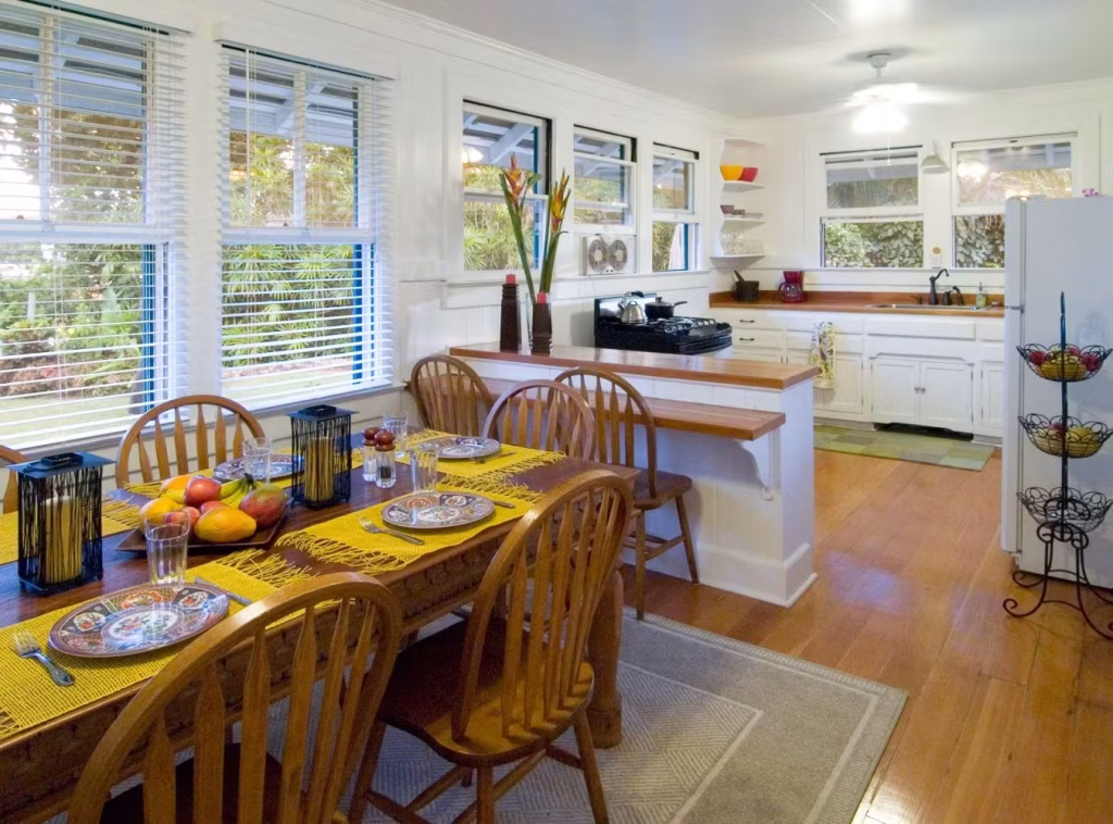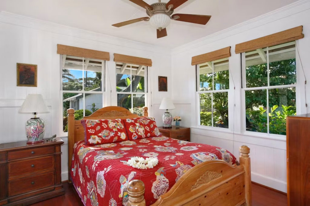 This charming property comprises a collection of plantation-style cottages, each individually decorated to offer a unique and homely experience. The cottages are thoughtfully adorned with local artwork and vintage Hawaiian quilts, creating a warm, inviting ambiance that beautifully resonates with the spirit of the island. Spacious lanais overlook the well-tended gardens, offering guests a peaceful nook to relax and enjoy Kauai’s scenic beauty. With studio and cottage options available, as well as the 3-bedroom Ohana House, the Fern Grotto Inn can accommodate solo travelers, happy couples, and whole families. Bicycles and SUPs are available to guests, as well as bicycles, gas barbeque grills, Wi-Fi internet, and onsite parking.