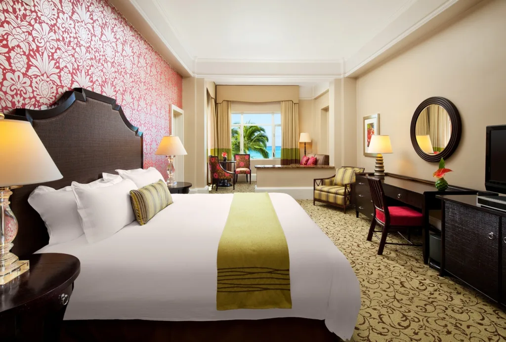 A recognizable pink hotel on the shores of Waikiki, The Royal Hawaiian Hotel is not just a Hawaiian landmark, but a chic and modern luxury resort in a sought-after beachside destination. Known by many as the “Pink Palace of the Pacific,” the resort offers guests a true Hawaiian experience with access to numerous cultural activities. Guests begin their vacation with a personal welcoming experience and are greeted with a fresh flower lei, refreshing juices, and scrumptious banana-nut bread. All 528 rooms and suites are outfitted with modern hotel amenities and feature an air of traditional Hawaiian elegance. Many accommodations offer private balconies with views of the Pacific Ocean. In-room high-speed internet access is available for a daily fee, and wireless internet access can be found in the hotel lobby.