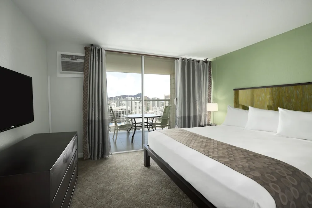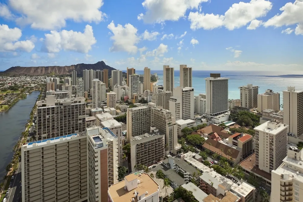Located just three blocks from the beach on the serene Ala Wai Canal, the Aqua Skyline Island Colony is the perfect hotel for visitors looking to indulge in the excitement of Waikiki without breaking the bank. One of the tallest buildings in Waikiki, this 44-story high-rise offers unparalleled views of the ocean, mountains, and the city of Honolulu. Guests may choose from standard rooms, studios, and one-bedroom kitchenettes, each with a spacious 108 square foot lanai.