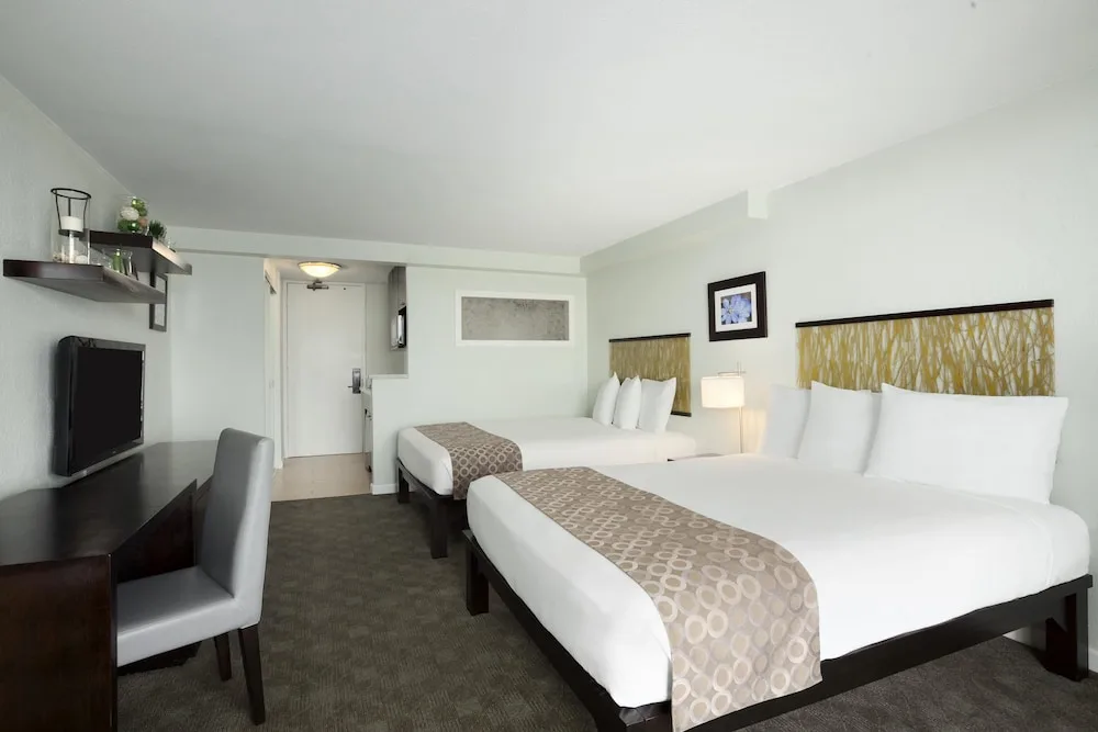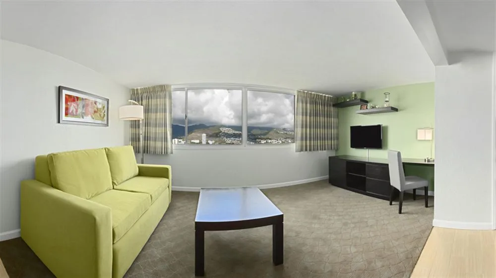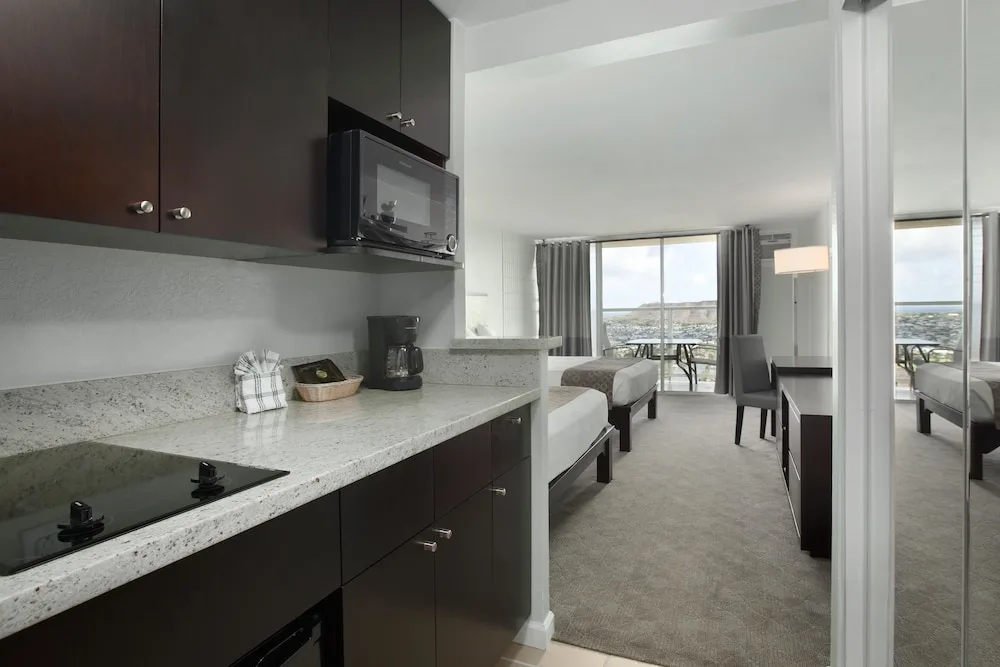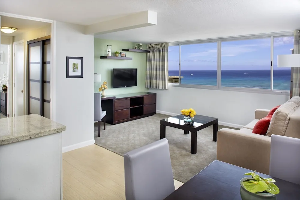 All rooms are equipped with a microwave, mini-fridge, and coffee maker, as well as dining utensils, free in-room safe, air conditioning, and high-speed internet access. Amenities include a pool, Jacuzzi, AquaSPA facilities, and an expansive sun deck. With a 24-hour guest-services agent, on-site laundry facilities, and a car rental desk, guests are sure to feel right at home during their Hawaii vacations.