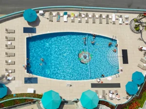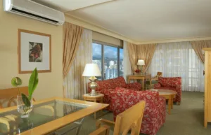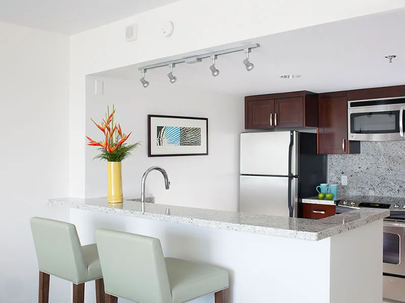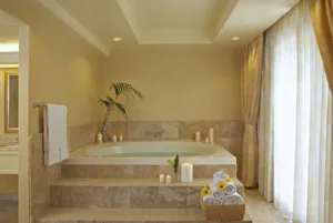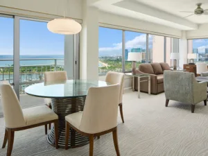 All of the suites have a fully equipped kitchen with stainless steel appliances and granite countertops, a spacious bathroom with a tiled massage jet shower, a living room with a wall-mounted 40-inch television, high-speed internet connectivity, and dual oscillating air conditioning systems. You can choose suites with either an ocean view, Sunset or pool View, or partial Ocean View. The luxury one and two-bedroom suites feature rooms with a King bed, a living room, and two bathrooms.