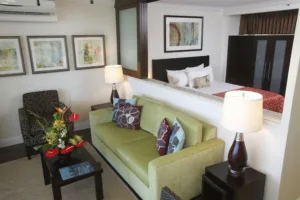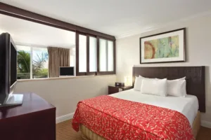 A posh condominium-style hotel located just one block from the beach, Outrigger Regency on Beachwalk provides guests with an elegant home-away-from-home on Oahu’s exciting and vivacious southern shore. All of the spacious 1-bedroom and 2-bedroom units are decorated with sleek, contemporary furnishing and feature full kitchens, floor to ceiling windows, and private outdoor balconies. Guests receive complimentary high-speed internet, daily maid service, and access to coin-operated laundry facilities. Parking is available at a rate of $20 per day.