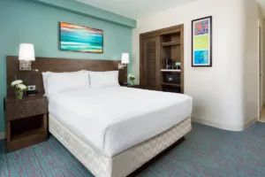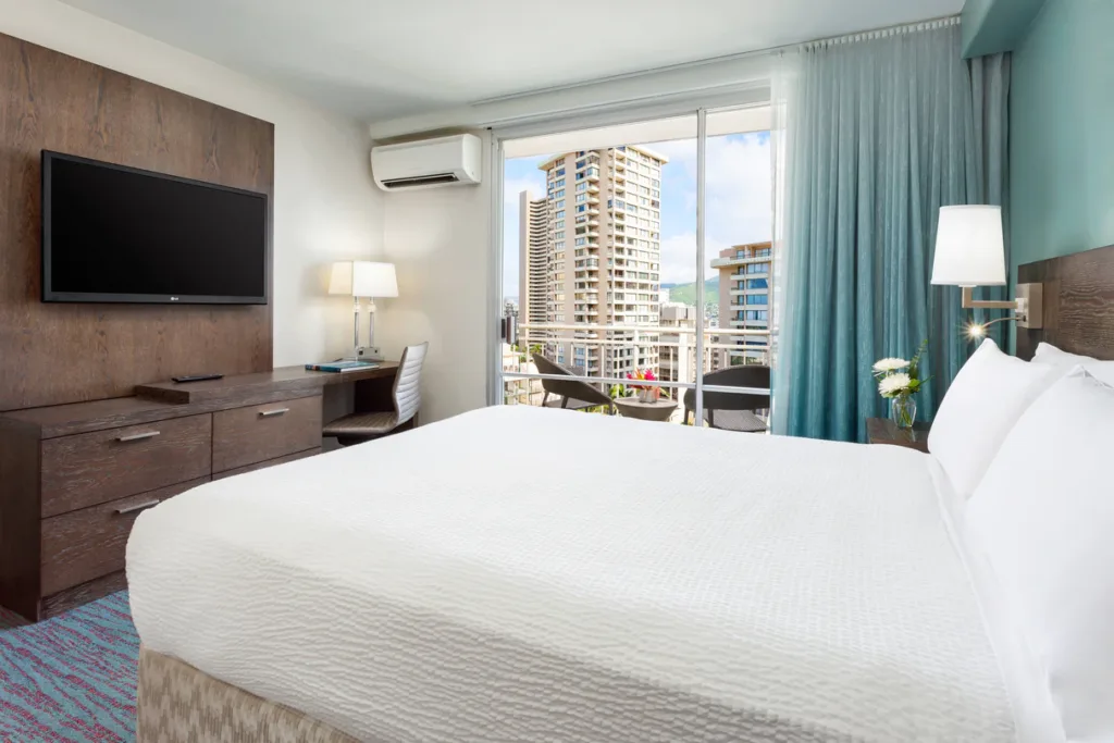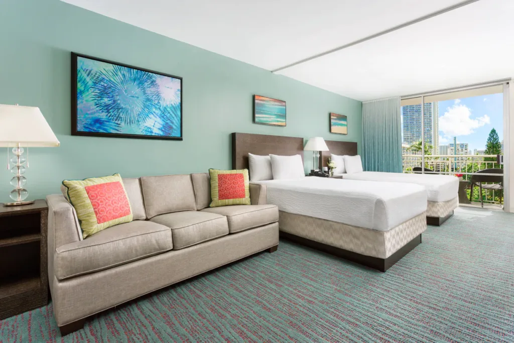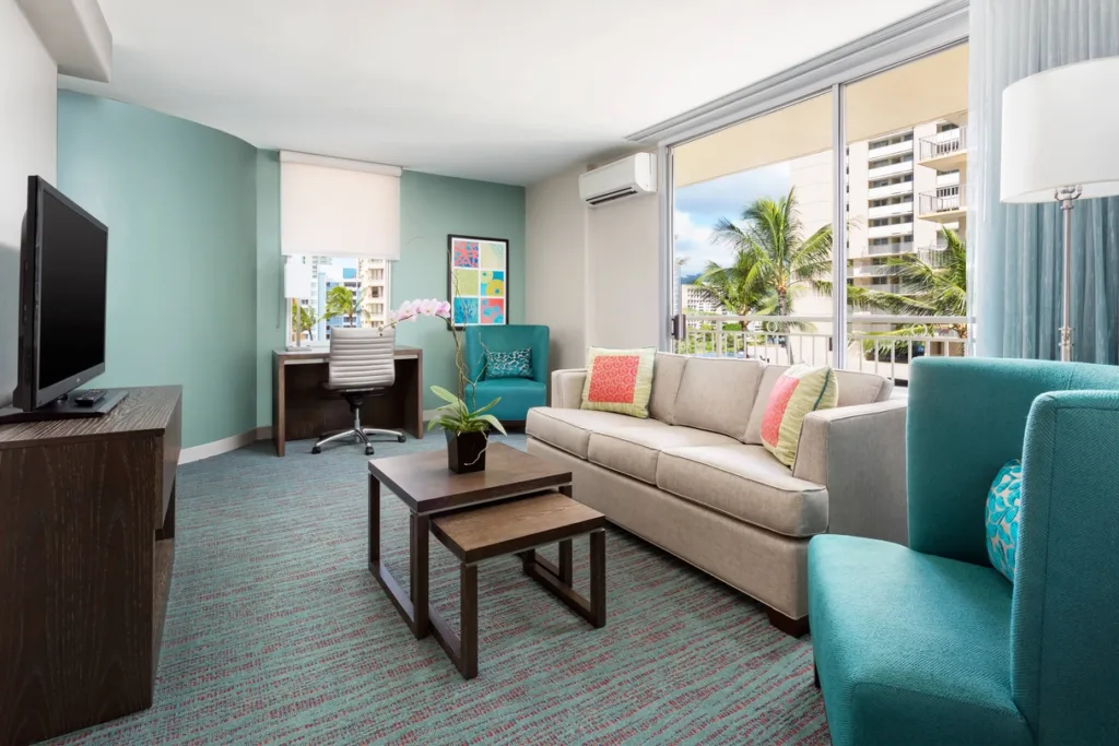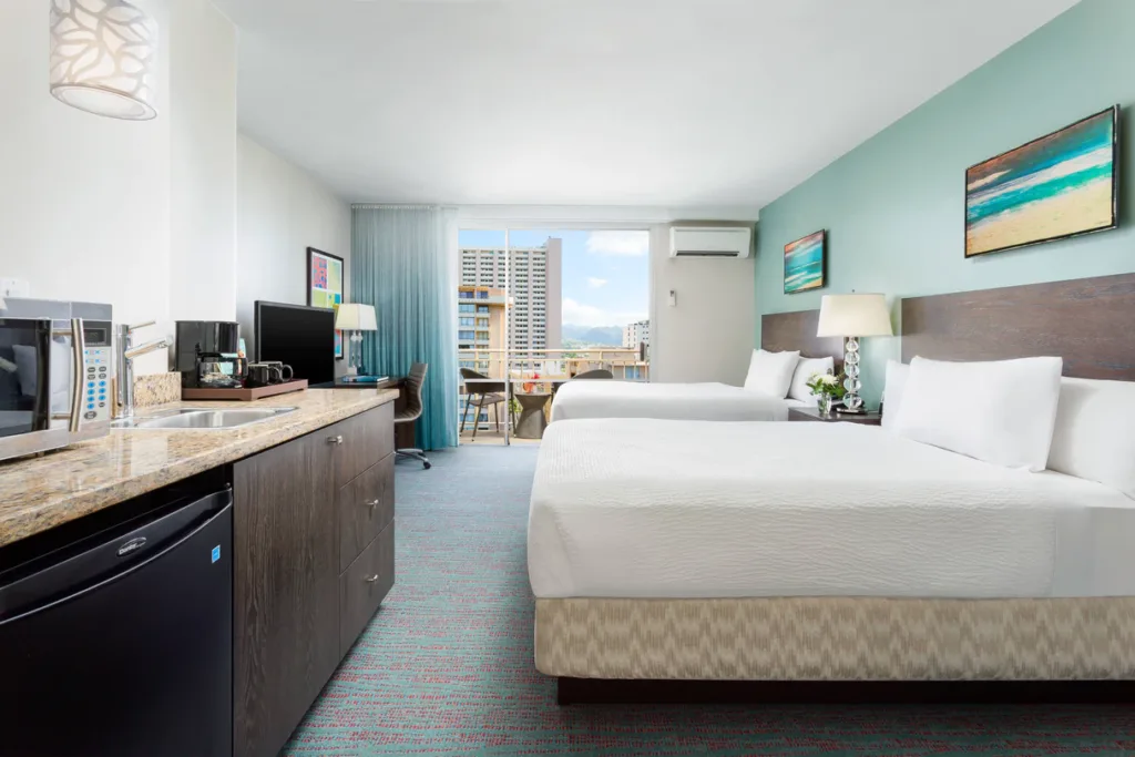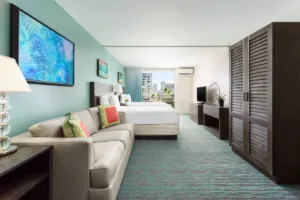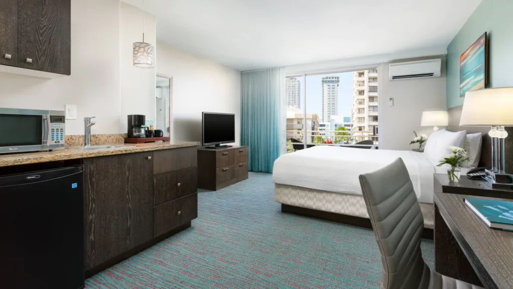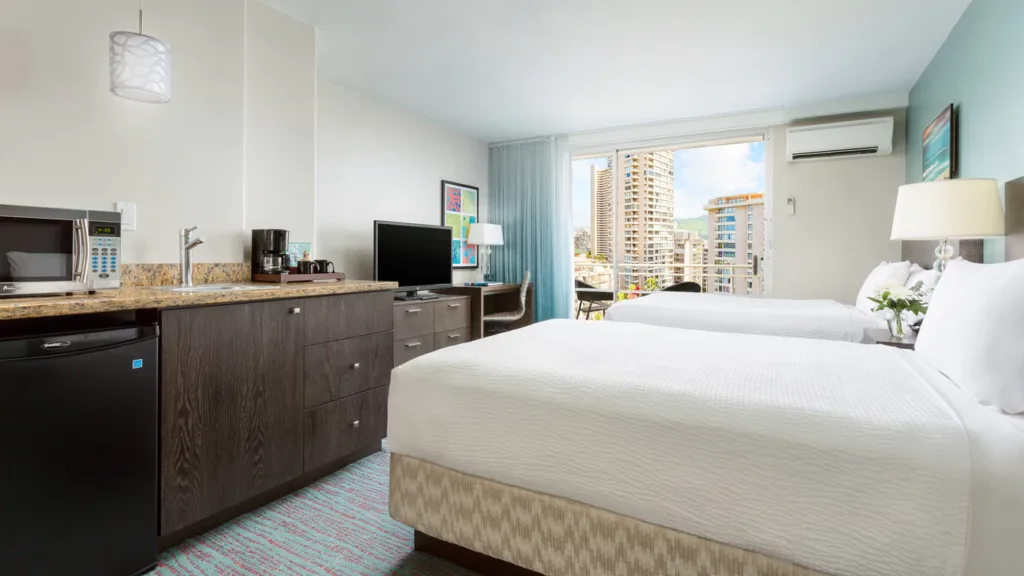All of the nonsmoking guestrooms feature chic island style décor with dark woods, soothing neutral tones, and crisp, luxurious linens. Pillow-top beds, flat-screen TVs, mini refrigerators, and complimentary high-speed internet access come standard with all accommodations. Several guestrooms and suites include microwaves, wet-bars, and private balconies. On-site amenities include two swimming pools, a whirlpool spa, and a fully-equipped fitness facility. The rooms and suites are meticulously crafted sanctuaries of relaxation. Each is adorned with modern amenities, plush furnishings, and a decor that echoes the hues and textures of the island, ensuring every guest feels the embrace of Hawaii from the comfort of their quarters.