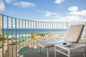 Perfect for the dynamic traveler, this room serves as an optimal launchpad to experience Oahu’s treasures. Spend your days shopping, exploring landmarks, embarking on adventures, and unwinding by the beach or at The Modern Honolulu’s inviting pools. Enjoy varying vistas of Waikiki or the hotel’s lush resort grounds. Each room boasts a plush king bed and a secluded terrace. Accessible amenities encompass lowered switches and shelves, toilet and tub grab bars, a bathtub bench, and a handheld showerhead. On request, guests can obtain a kettle or microwave.each room showcases captivating ocean, partial ocean, or city vistas and boasts artisanal furnishings, teak accents, expansive showers, and sleek terrazzo countertops.