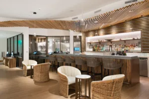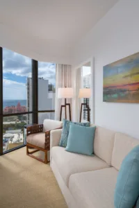 The rooms and suites at the Hyatt Centric Waikiki are carefully appointed. It has modern amenities like rainfall showers and full-soaked tubs in some suites. The rooms have floor-to-ceiling windows, maximizing stunning views. Rooms feature 55” smart televisions, Keurig coffee machines, and Wi-Fi.