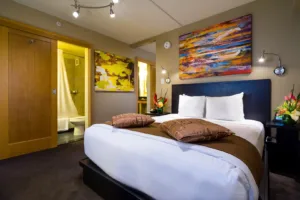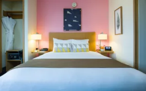 The Musician Suite at the Vive Hotel Waikiki is a vibrant, 60s-themed penthouse room with a prime ocean view and a carefully curated retro theme. The wall-sized and stylized portrait of John Lennon smiles back at you under a Sputnik-like chandelier. The penthouse Library Suite is a soothing space stacked with many dozens of titles and an oversized work desk and glass chandelier that provide a quiet elegance.