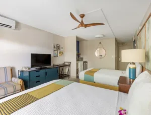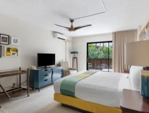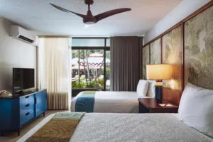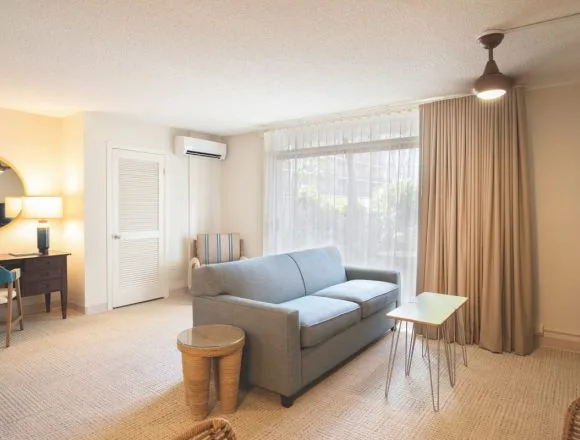 There are nine room and suite options at the White Sands Hotel, with poolside and pool view options available. Amenities at the dog-friendly White Sands include private lanais, high-speed Wi-Fi, weekly live music, a weekly yoga class by a certified instructor, a “grotto-style” hot tub, and 24-hour desk service and security.