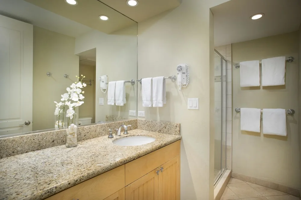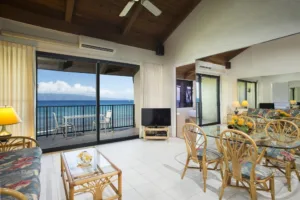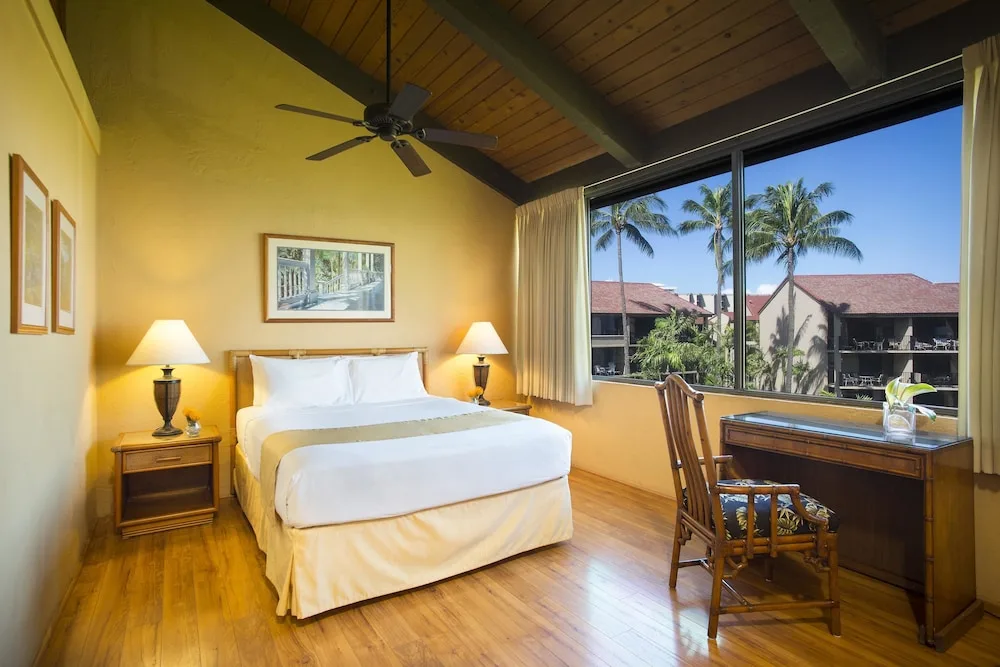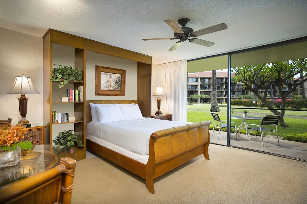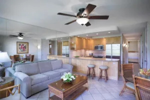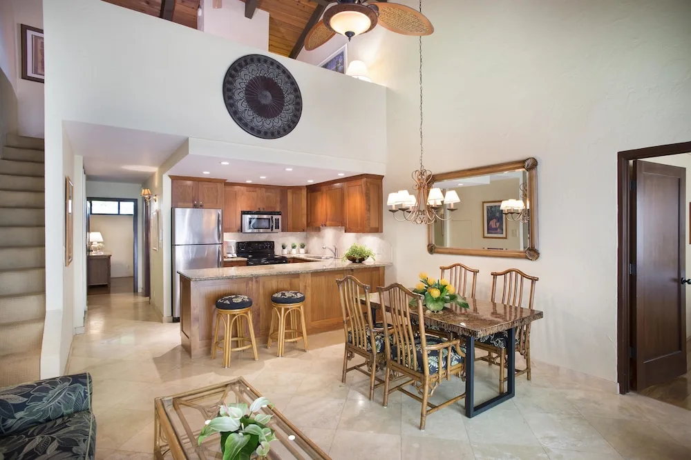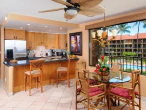 Guestrooms include studios, one-bedroom, two-bedroom, and three-bedroom suites. Each condo is designed with an emphasis on comfort and functionality. All accommodations are equipped with full kitchens, private balconies, and en-suite washers and dryers. Complimentary WiFi internet access is available throughout the resort property. The interiors are accentuated with island-themed decor, reflecting the vibrant hues and patterns of Maui.