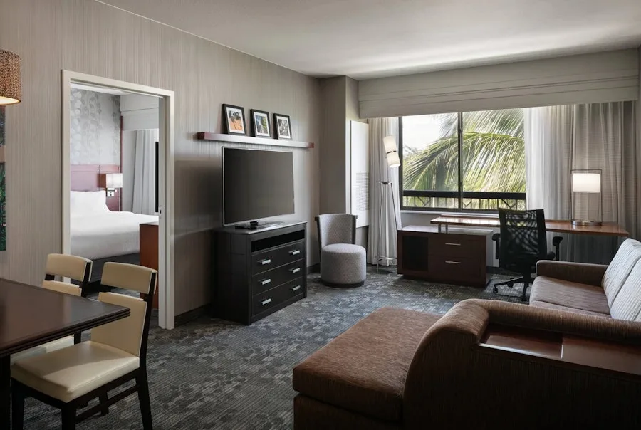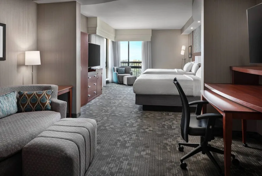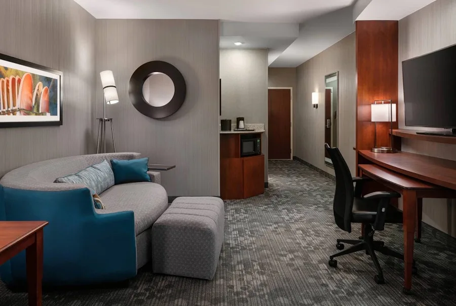 As part of the Marriott brand, guests can expect clean rooms, suites, and essential amenities like free Wi-Fi, a restaurant, a fitness center, an outdoor pool, and a meeting space.