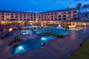 Accommodations include 309 spacious guestrooms and two suites. In-room amenities include complimentary internet access, large work spaces, in-room refrigerators, and private lanais. Perfect for meetings and events, the hotel boasts four meeting rooms and over 5,000 square feet of meeting space. The property features well-appointed rooms and suites that are designed with a blend of traditional Hawaiian aesthetics and contemporary amenities. Spacious and inviting, each room offers a serene escape with comfortable beds, modern furnishings, free Wi-Fi, flat-screen TVs, and private balconies with ocean or garden views.
